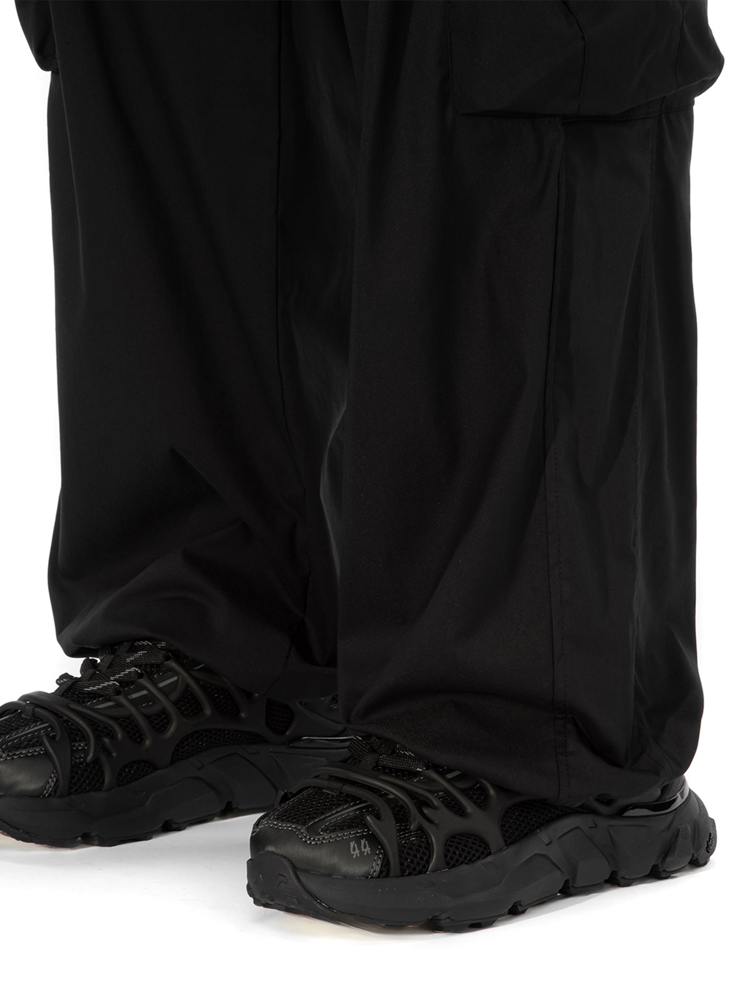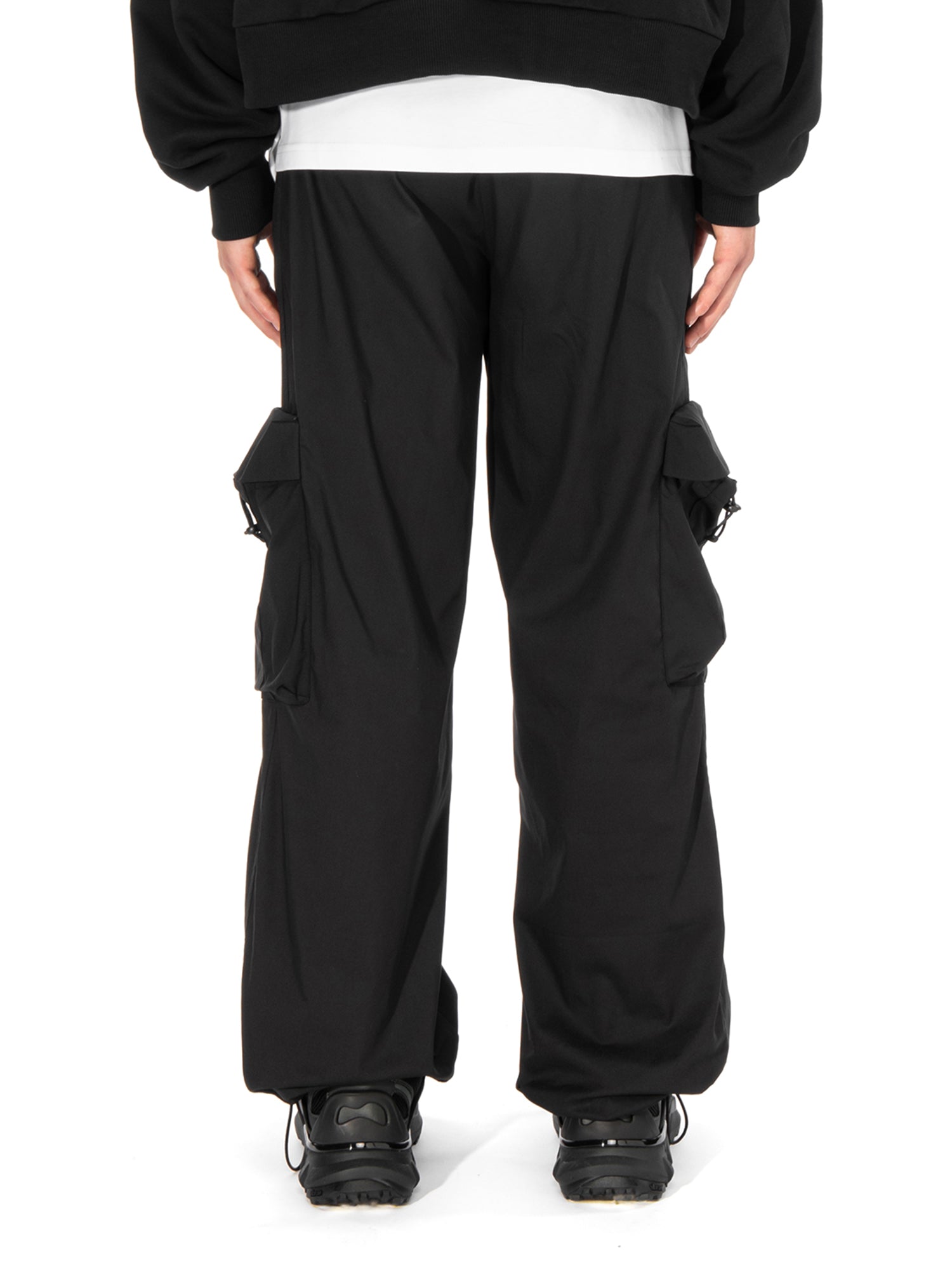 Vita elasticizzata regolabile. Tasche laterali con zip. Tasconi sulle gambe con stopper. Orlo regolabile alla caviglia. Etichetta applicata.