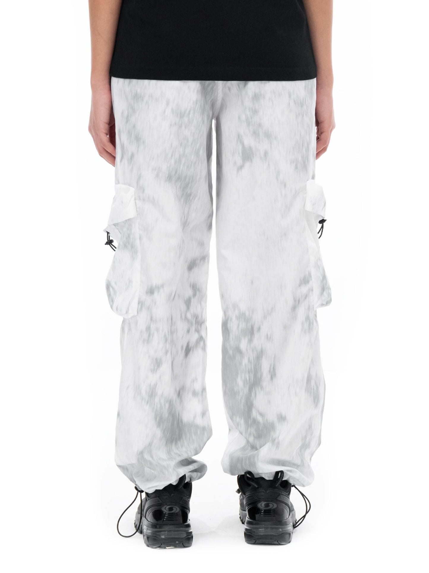 Vita elasticizzata regolabile. Tasche laterali con zip. Tasconi sulle gambe con stopper. Orlo regolabile alla caviglia. Etichetta applicata.