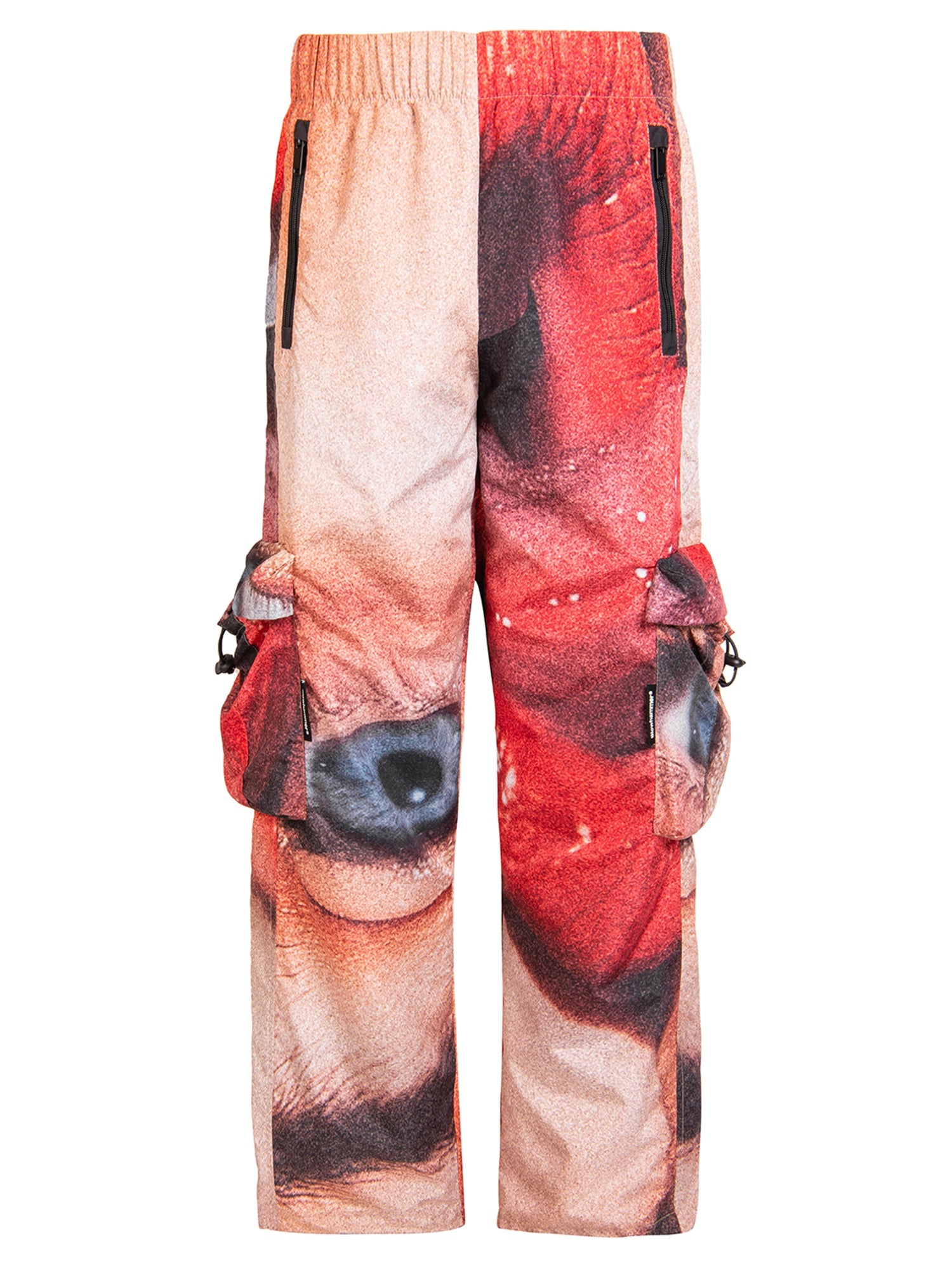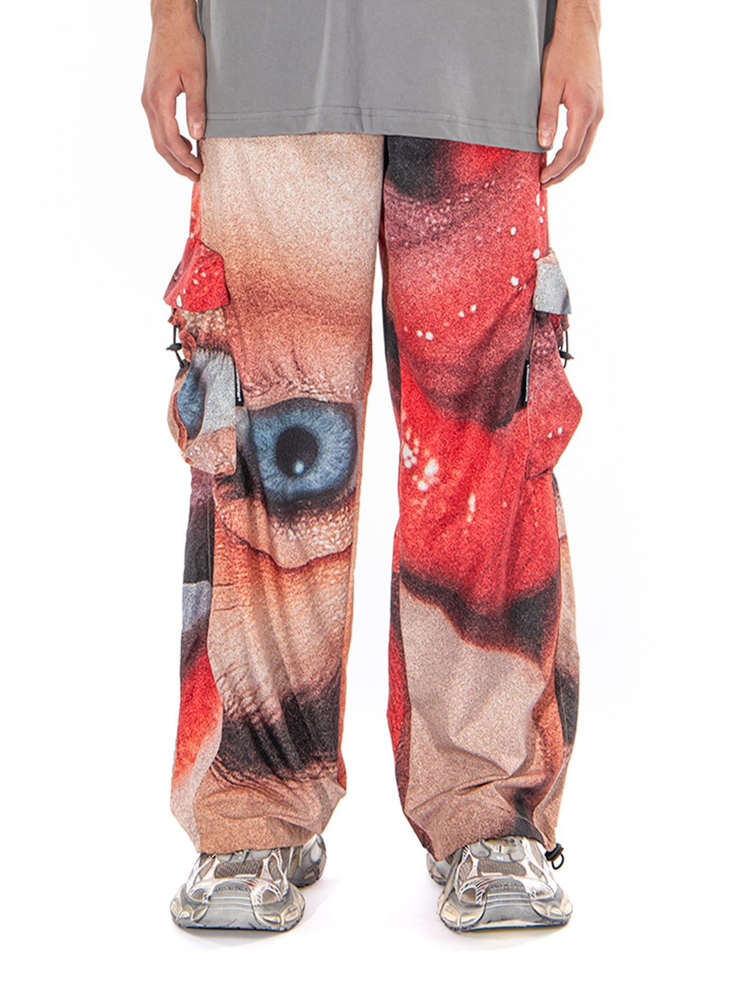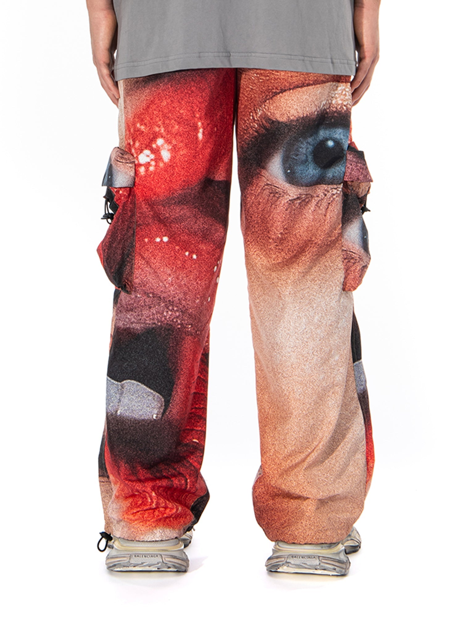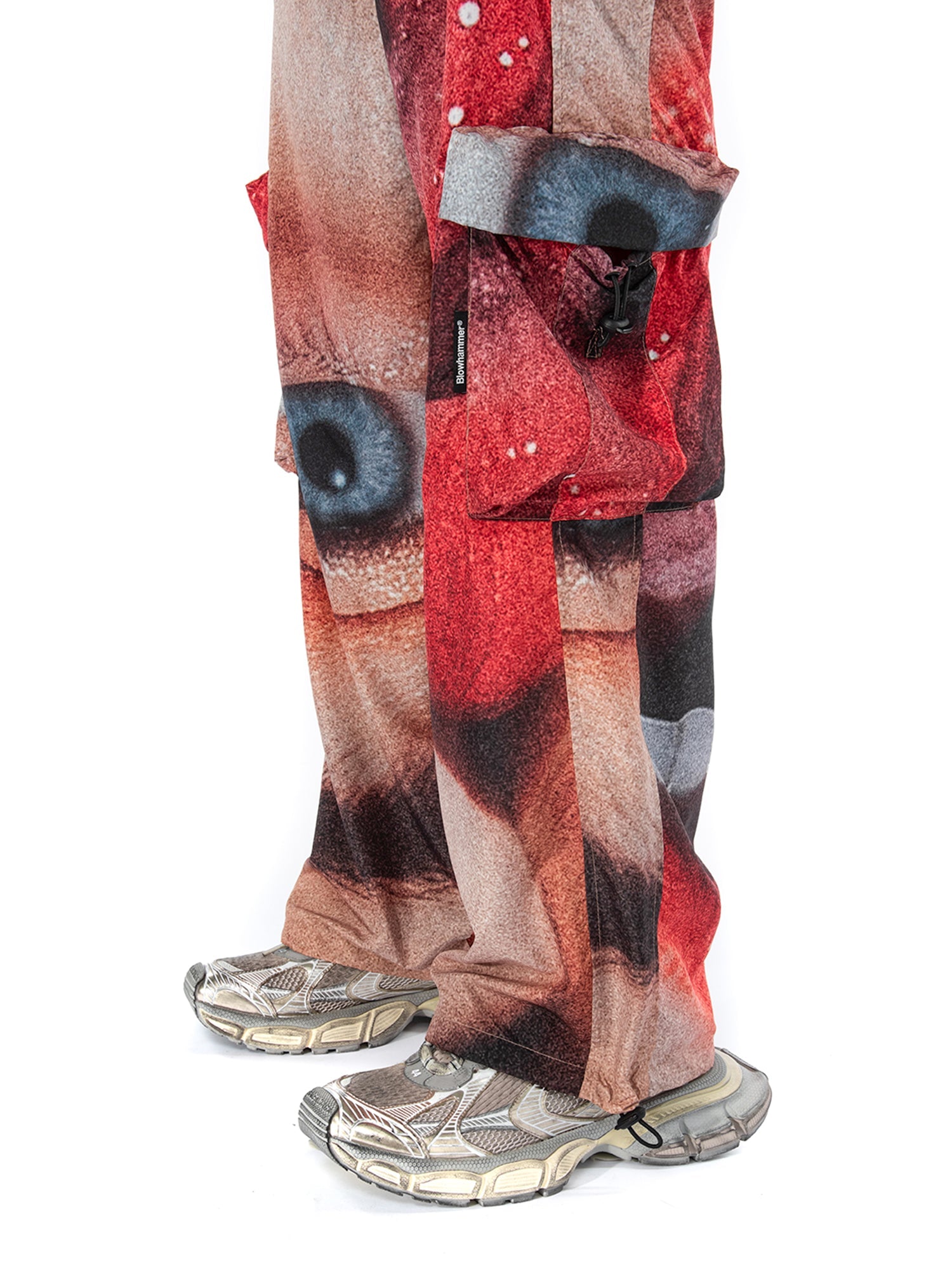Vita elasticizzata regolabile. Tasche laterali con zip. Tasconi sulle gambe con stopper. Orlo regolabile alla caviglia. Stampa a sublimazione ed Etichetta applicata.