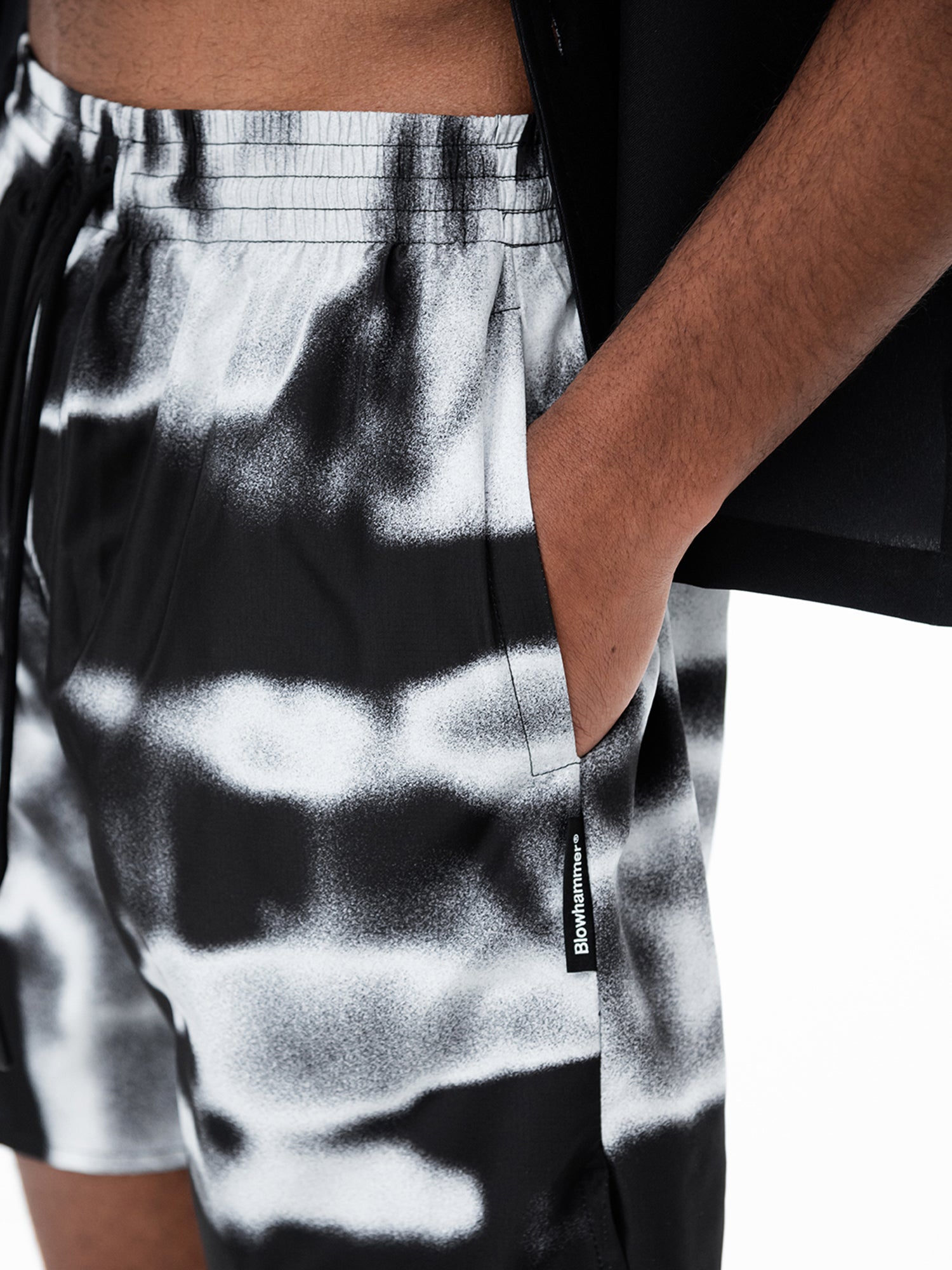 Vita elasticizzata con coulisse. Tasche laterali. Retina interna. Stampa a sublimazione ed Etichetta applicata.