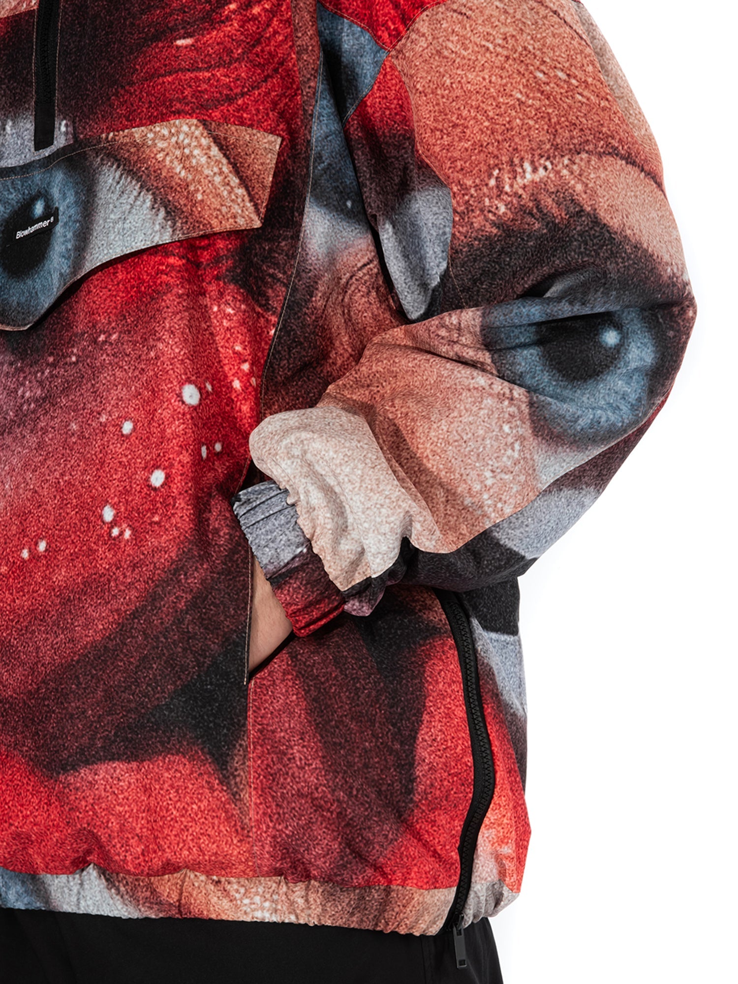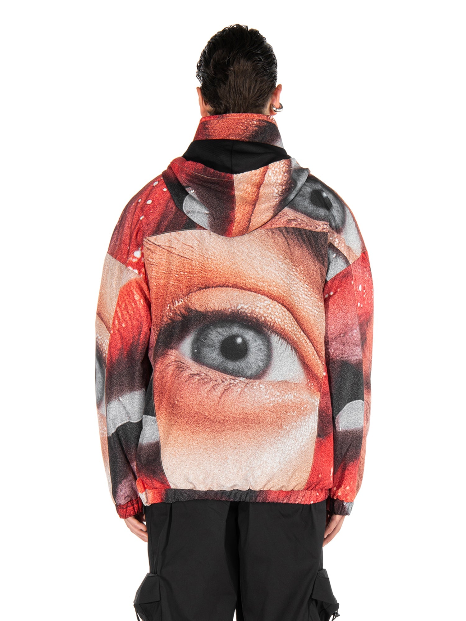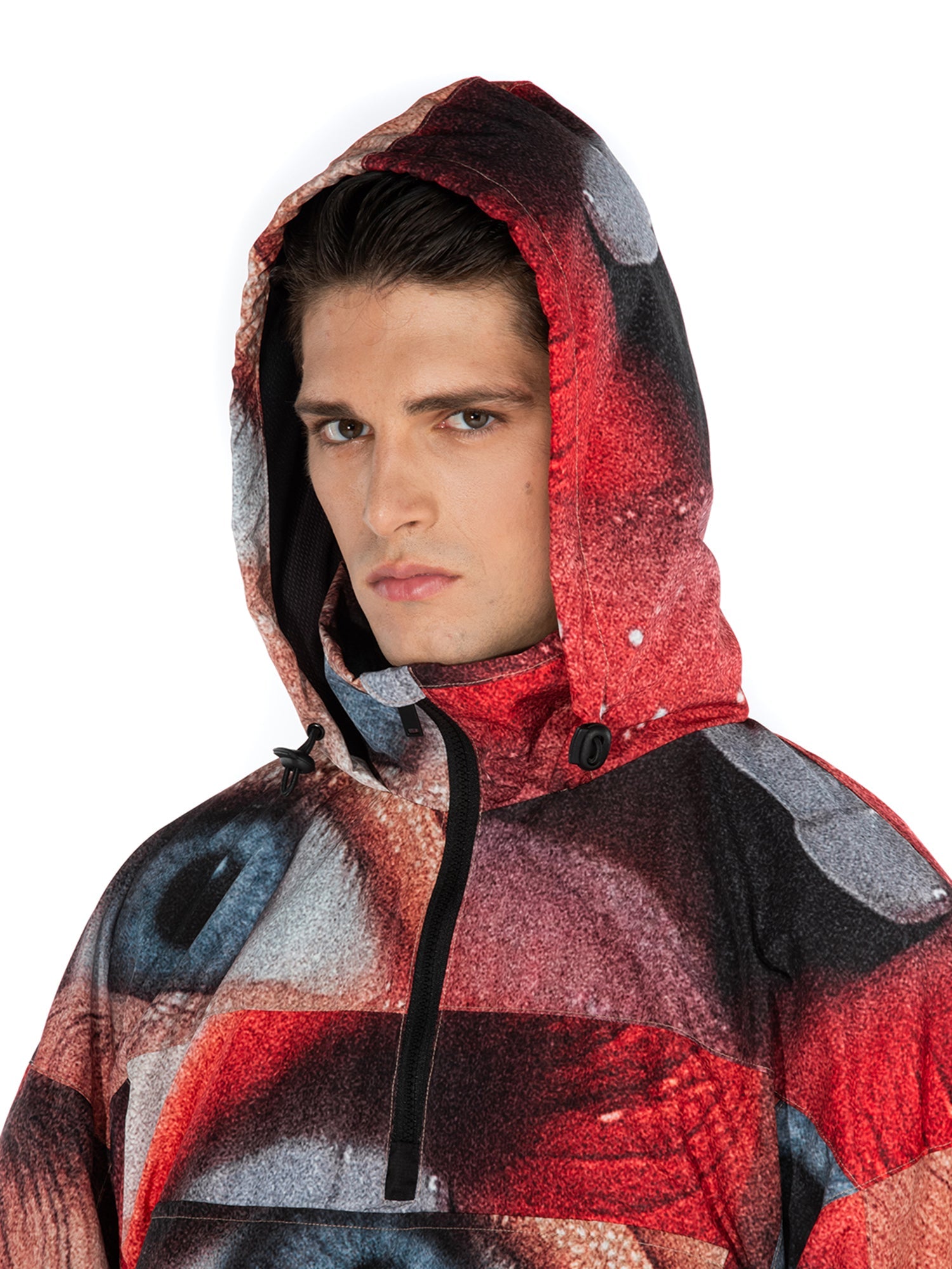 Cappuccio regolabile. Chiusura con cerniera lampo corta. Tasca a marsupio. Polsini e fondo elastico Stampa a sublimazione. Etichetta applicata.