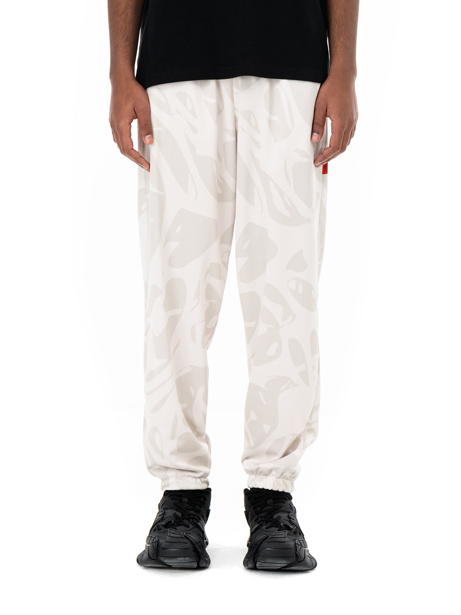 Vita elasticizzata con coulisse. Tasche laterali. Orlo con polsino elastico. Stampa digitale ed Etichetta applicata.