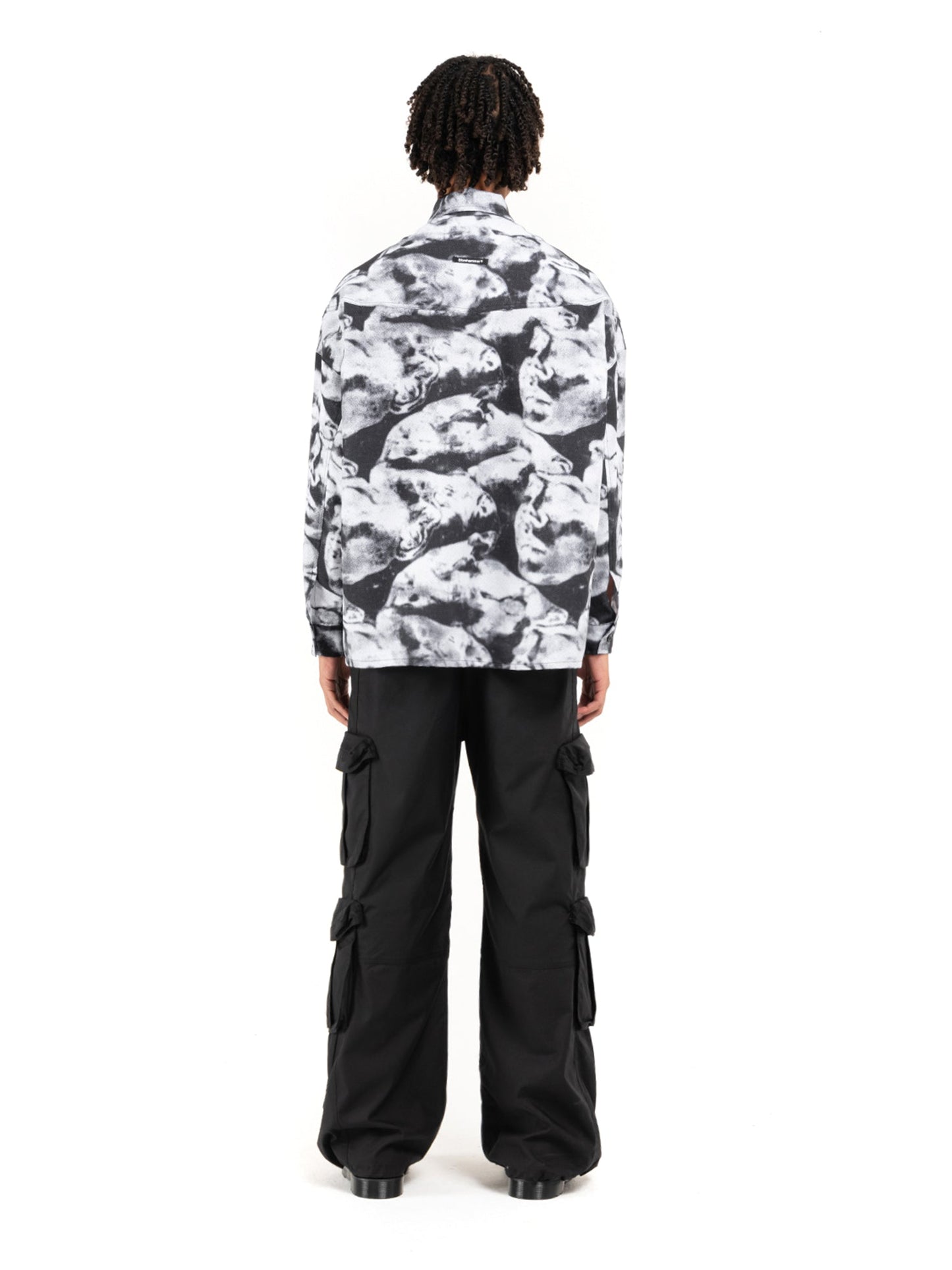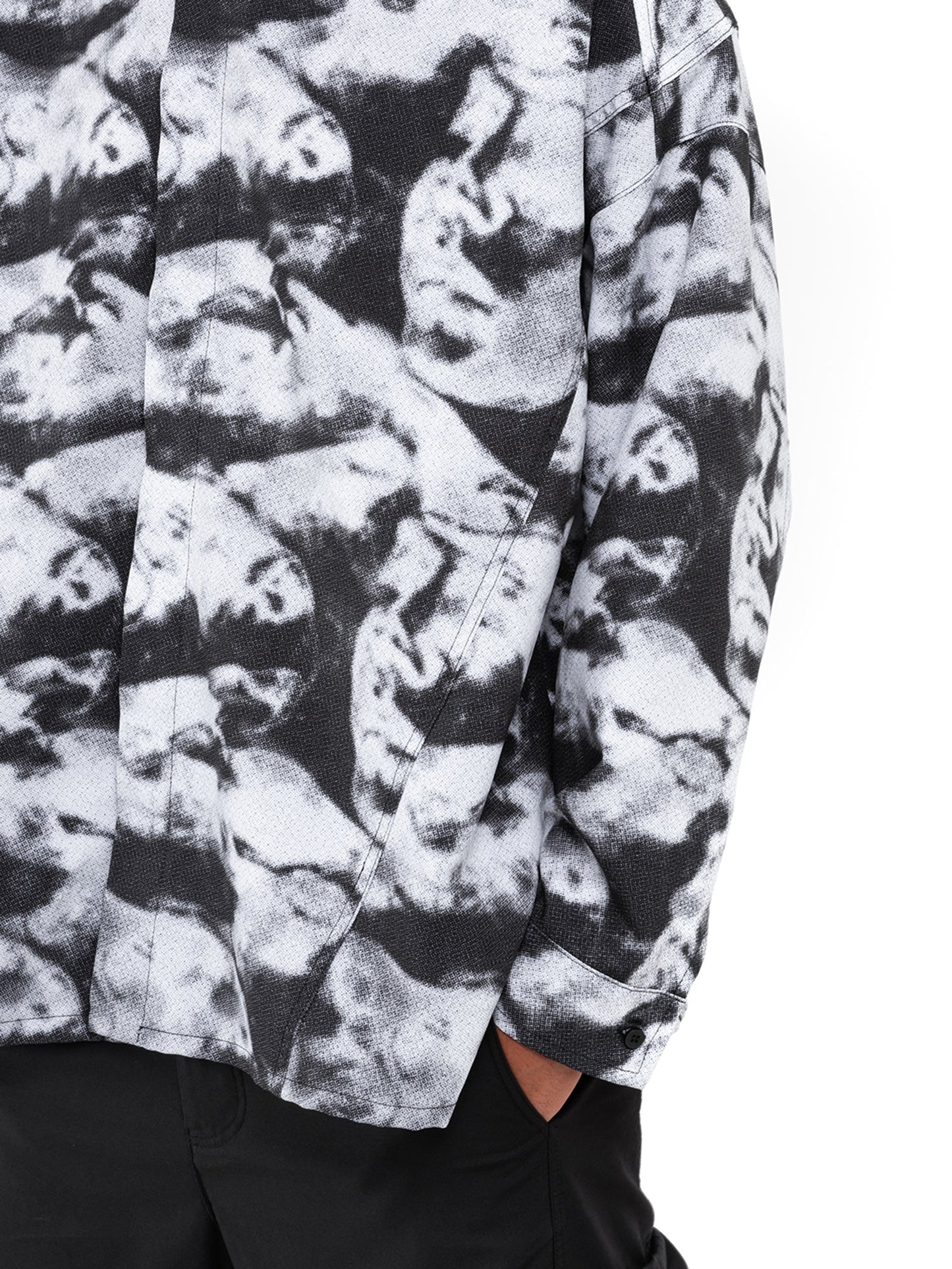 Colletto ampio. Chiusura con bottoni nascosti. Maniche lunghe. Stampa a sublimazione.