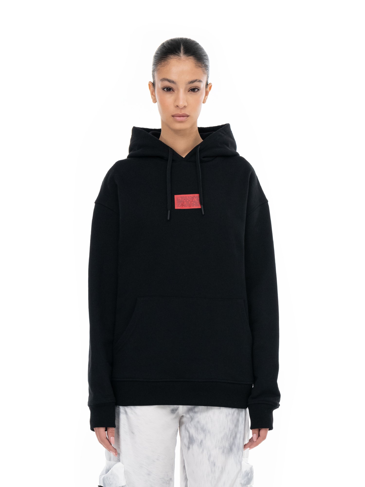 Cappuccio regolabile con laccio. Tasca canguro. Finiture a coste. Stampa digitale ed Etichetta applicata.