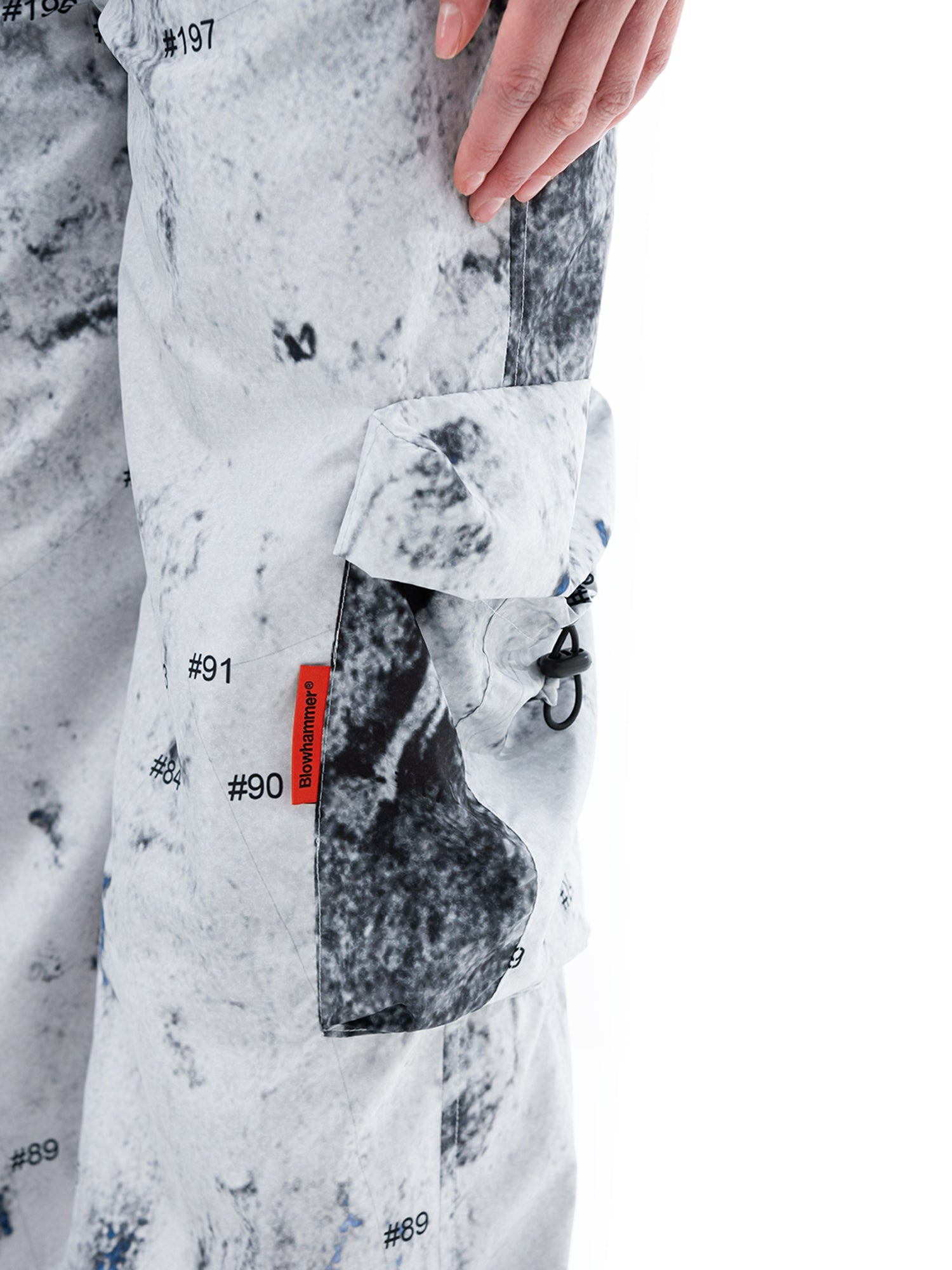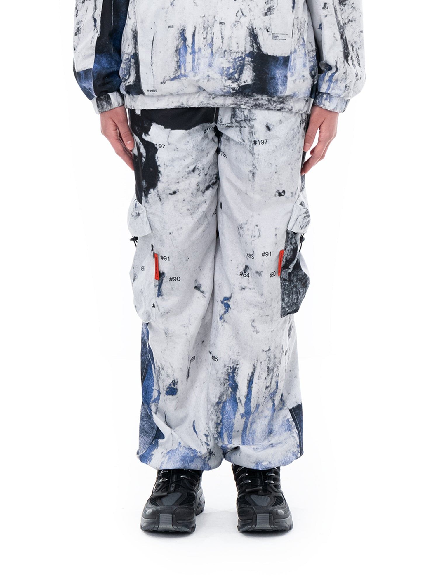 Vita elasticizzata regolabile. Tasche laterali con zip. Tasconi sulle gambe con stopper. Orlo regolabile alla caviglia. Stampa a sublimazione ed Etichetta applicata.