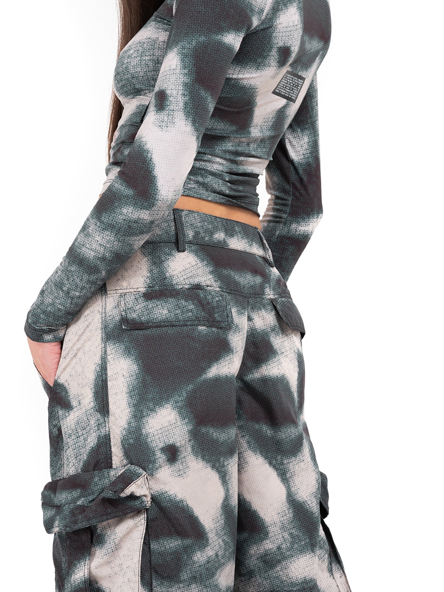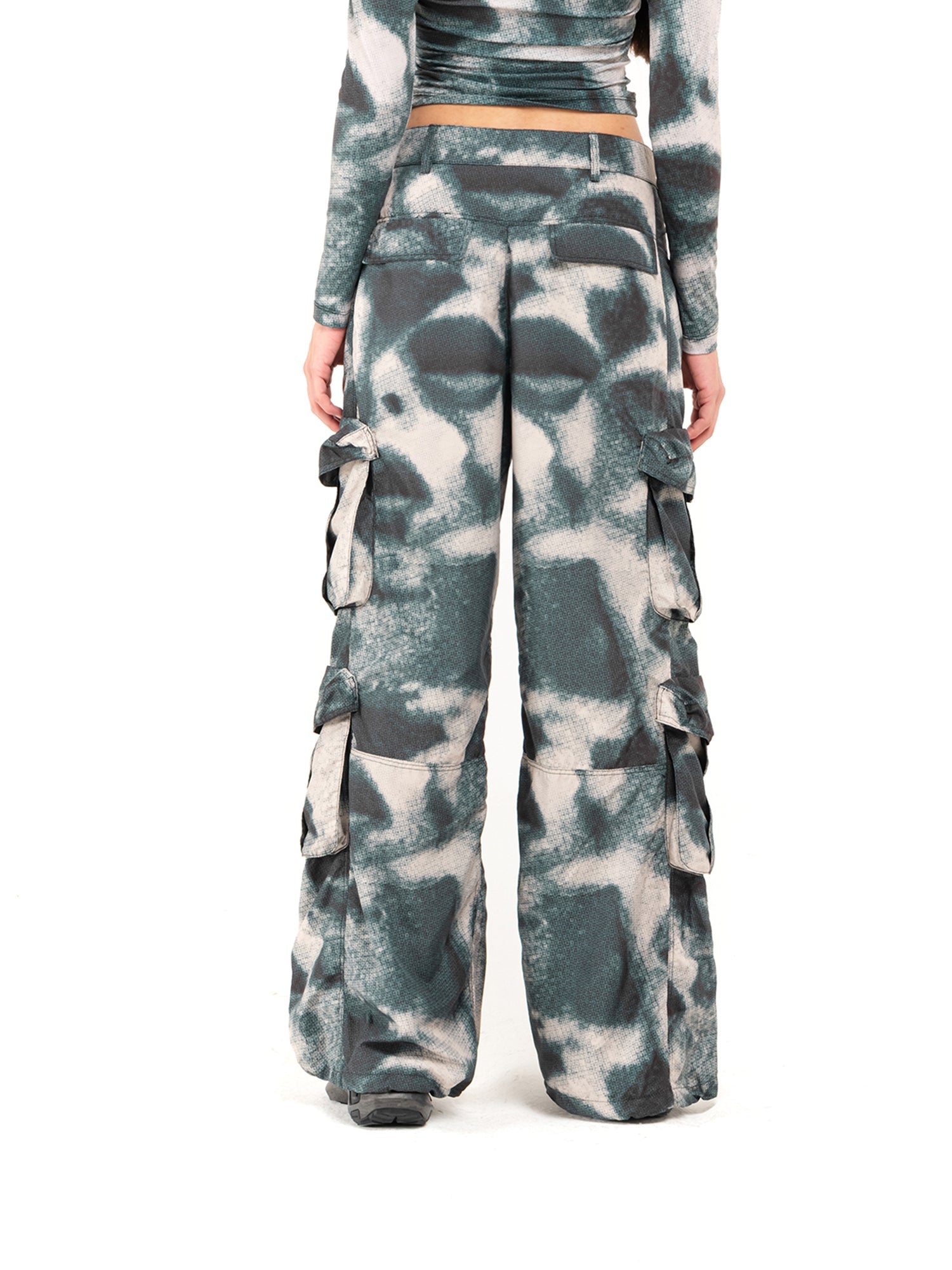 Vita con bottoni e passanti. Tasche laterali. Tasconi sulle gambe. Stampa Sublimatica. Orlo regolabile alla caviglia con coulisse.
