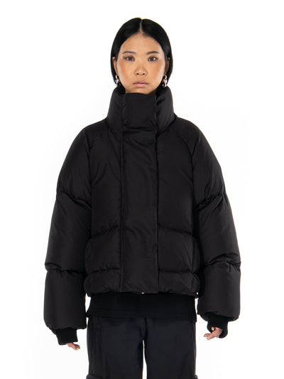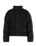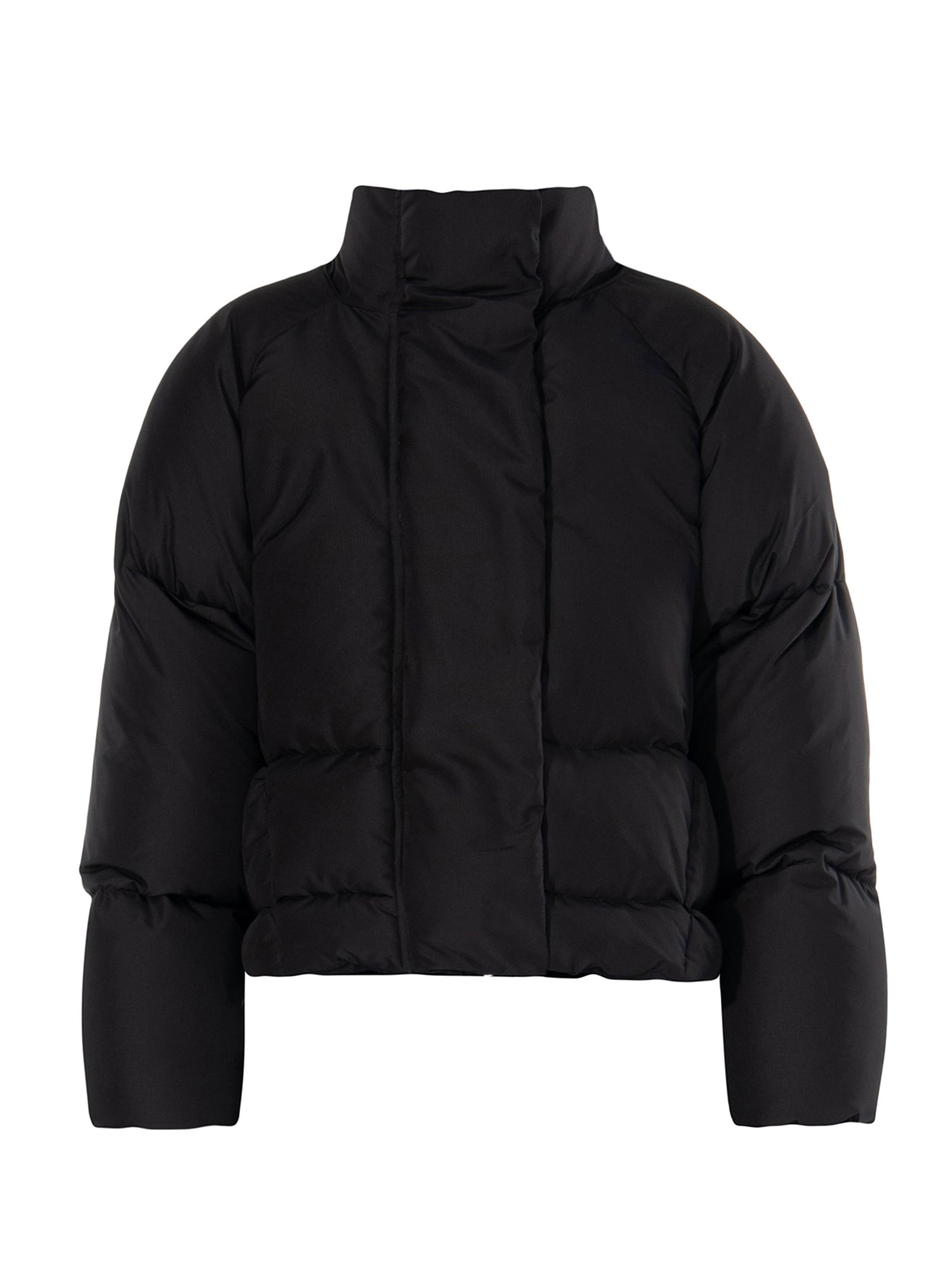 Collo a imbuto. maniche lunghe. chiusura frontale nascosta. due tasche frontali con zip. Orlo dritto. Foderato. Imbottitura in piuma d'oca. Stampa sublimatica. Stampa digitale. Etichetta applicata.