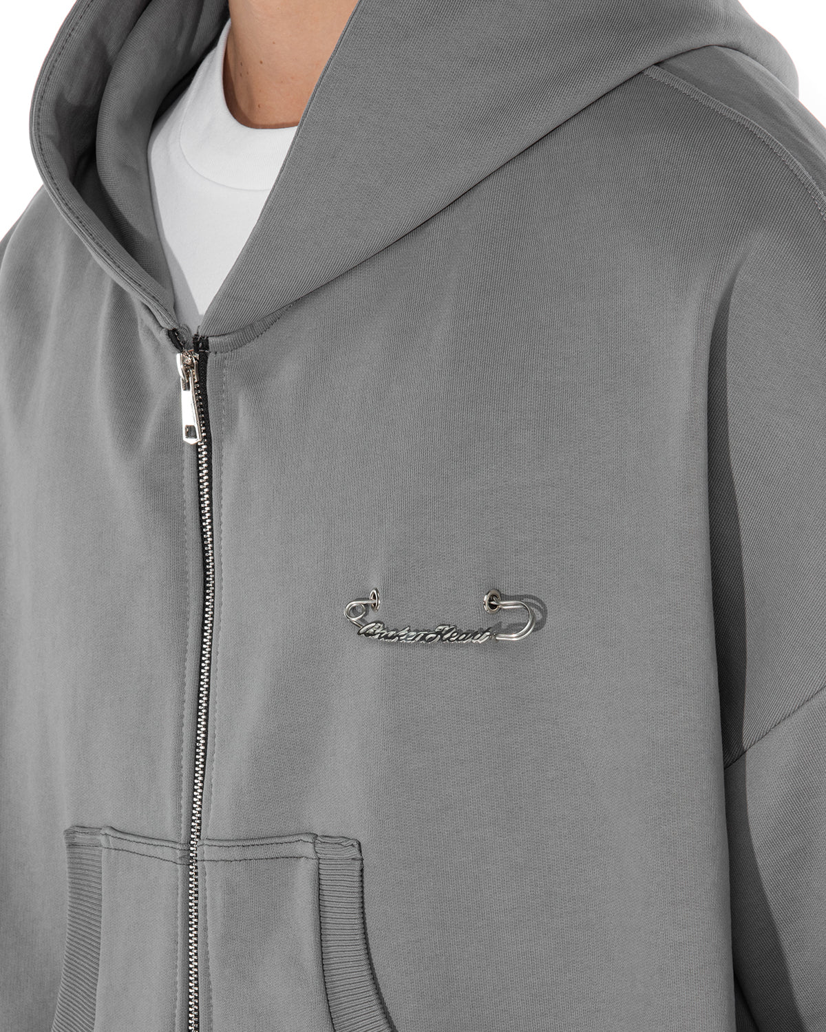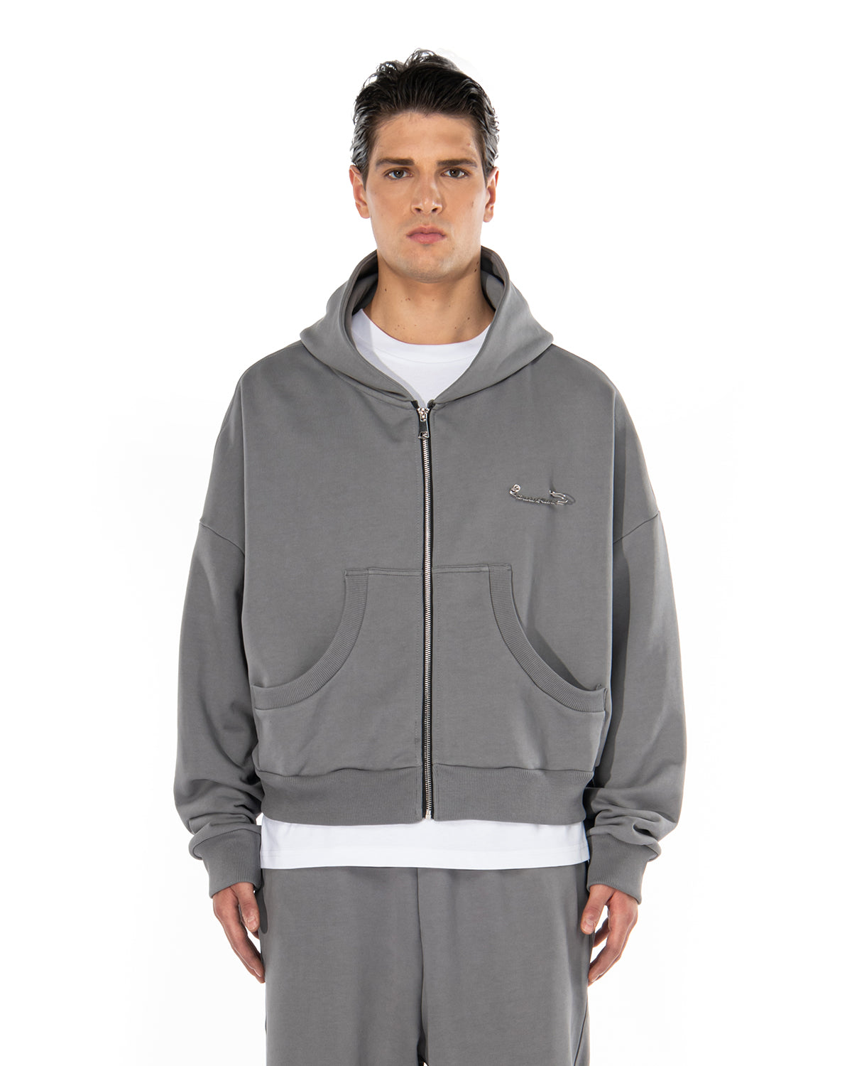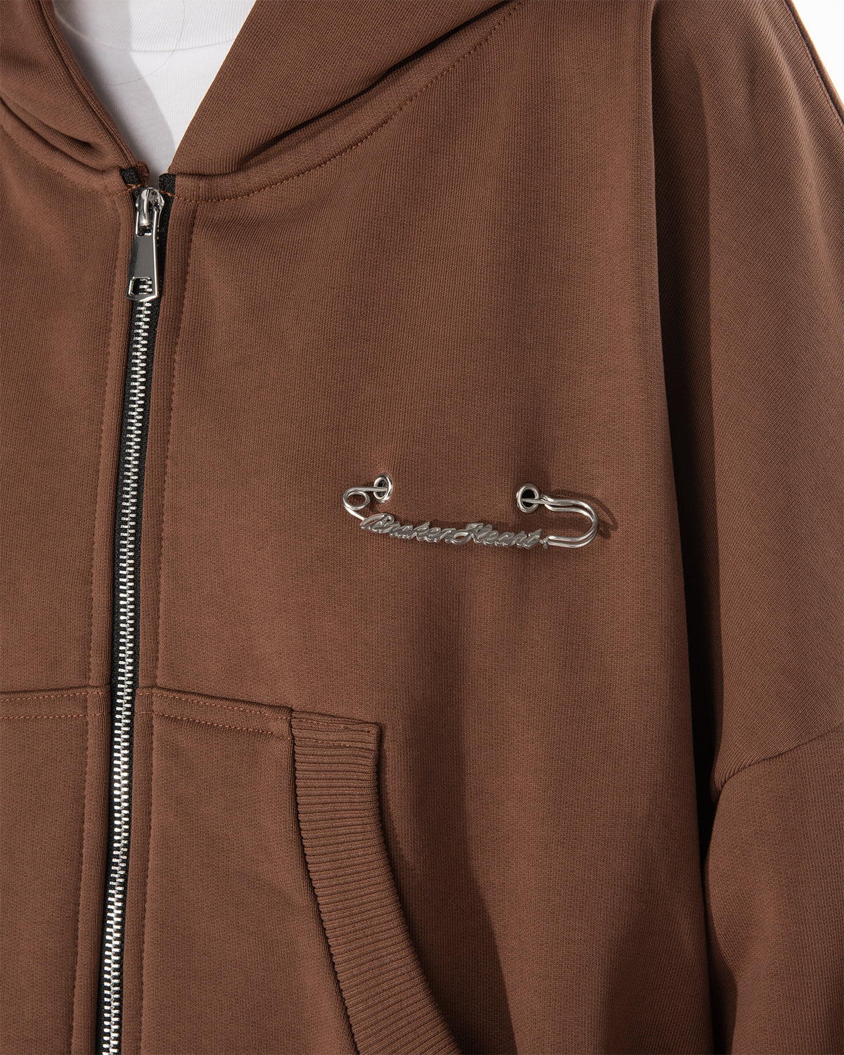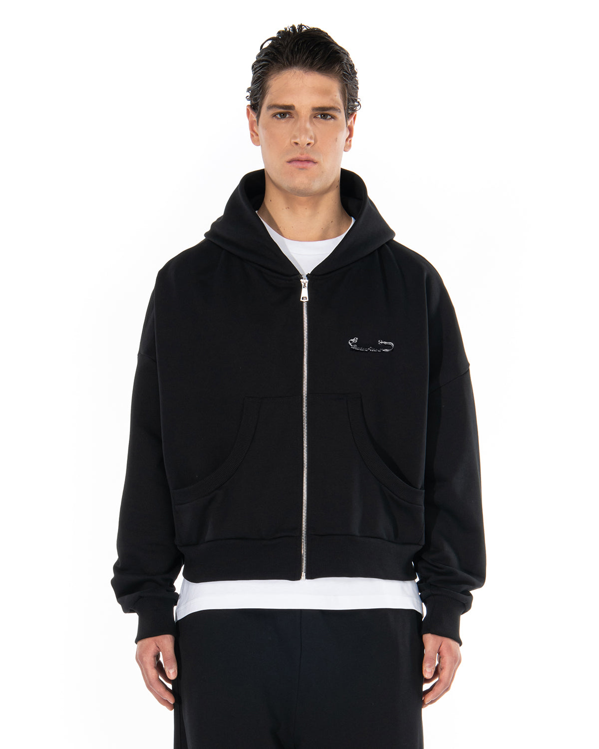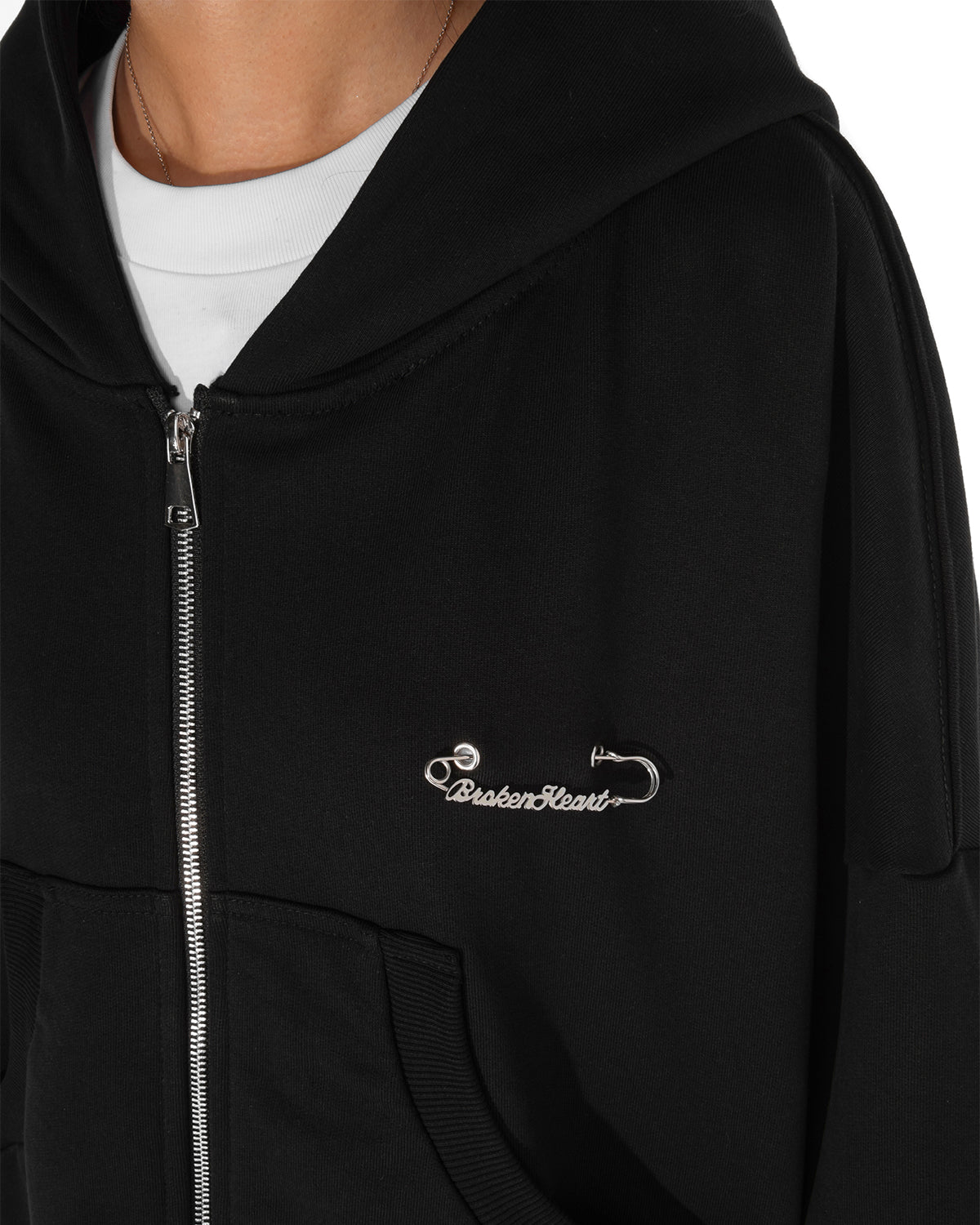 Cappuccio, maniche lunghe, chiusura frontale con Zip, due tasche laterali. Spilla "BROKENHEART ". Etichetta applicata.