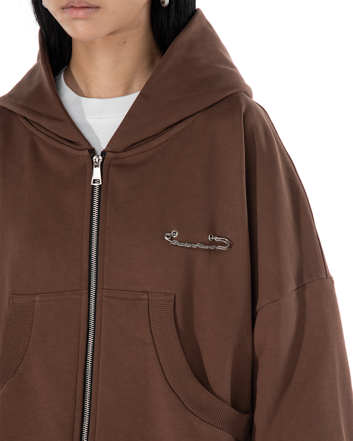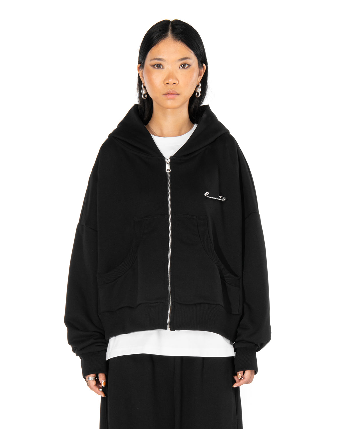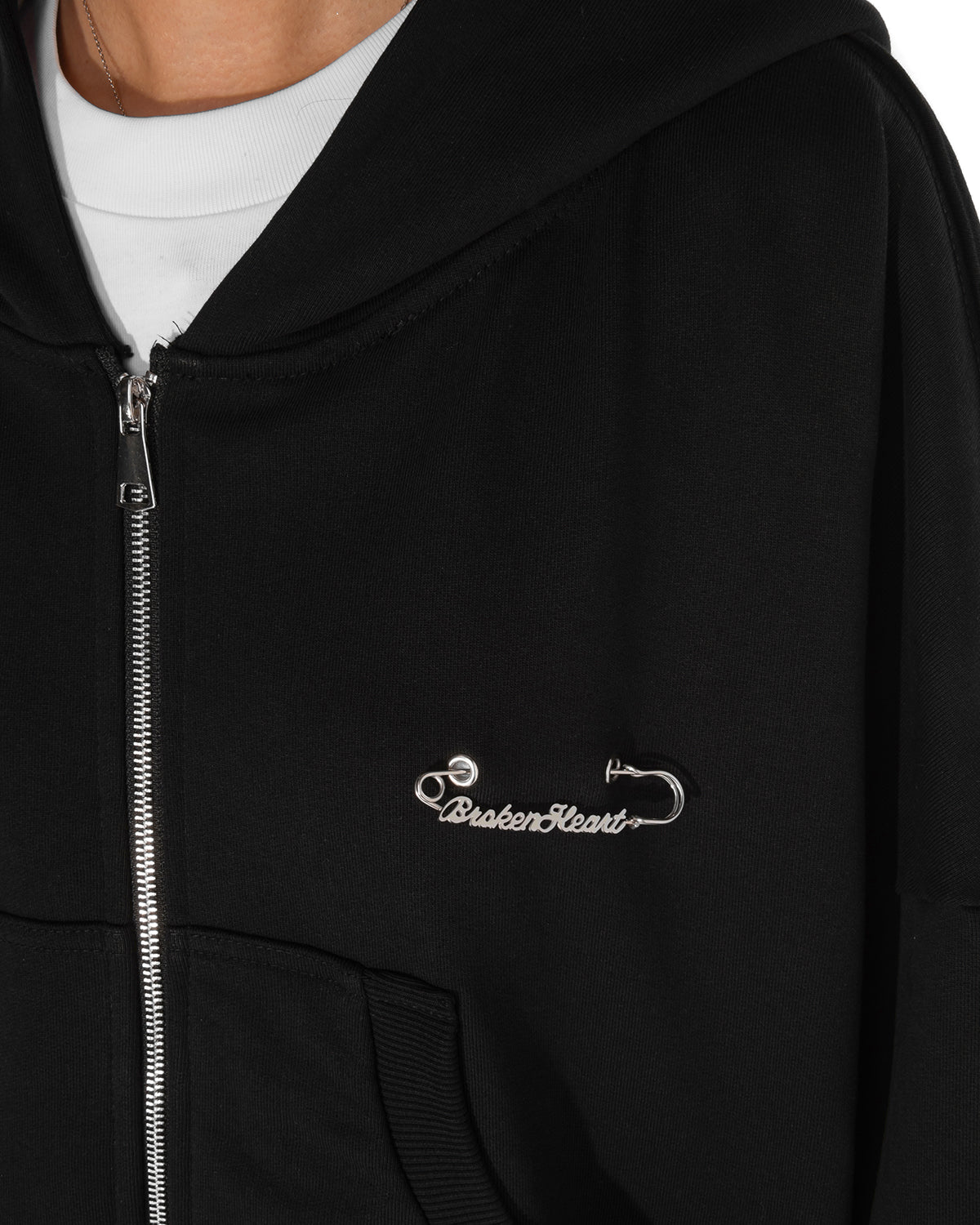 Cappuccio, maniche lunghe, chiusura frontale con Zip, due tasche laterali. Spilla "BROKENHEART ". Etichetta applicata.